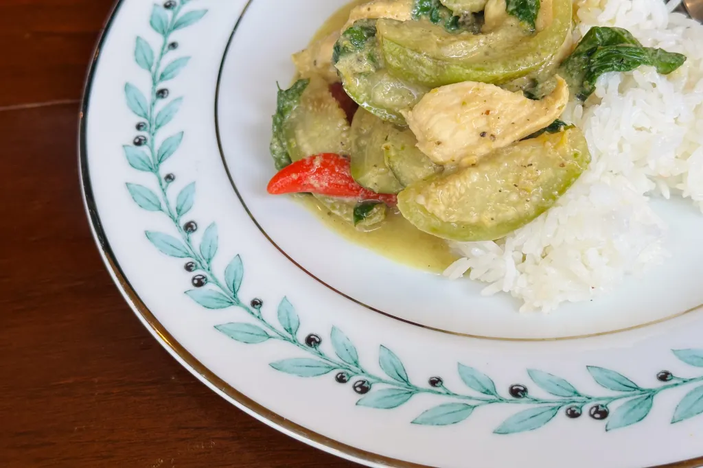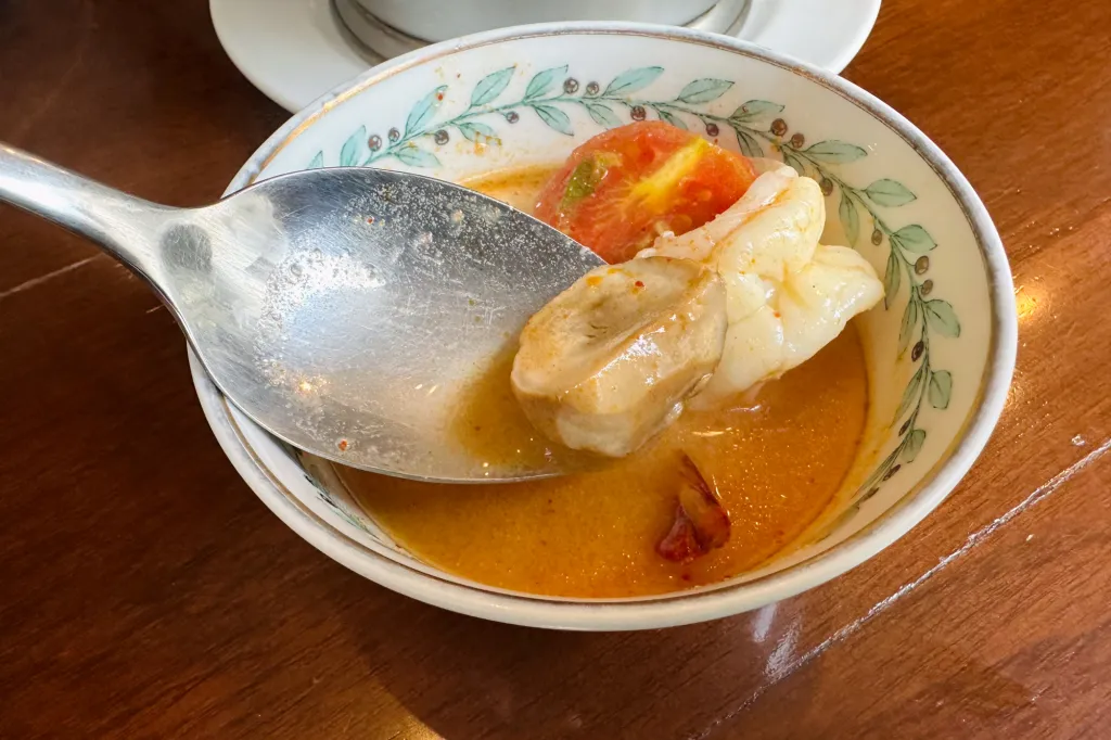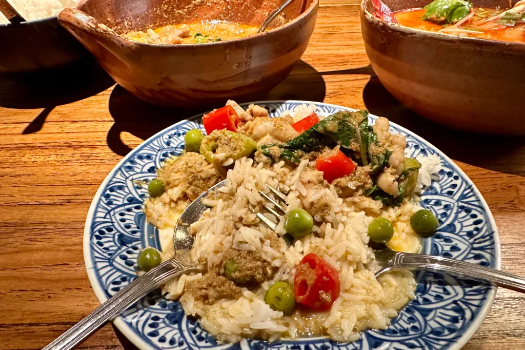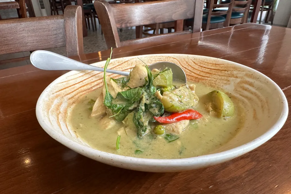 ここで注文したのは、店に入ったら必ず頼むトムヤムクン。ひとりには驚くほどの量だったので「ハーフはありませんか?」と聞いたが、ないとのこと。ならばひとりで食べ切るしかない。もう一品はグリーンカレー風の何か(正式名称は失念)。メニューの写真を撮り忘れたので、料理写真だけ載せておく。