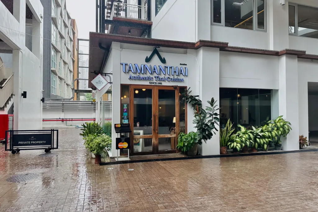 何度もバンコクに滞在しているので、今回の滞在で見つけたレストランと宿を紹介していく。まず、バンコクに着いた夜に入ったレストラン「タムナン タイ(ร้านอาหารตำนานไทย นานา-เพลินจิต)」である。ここはNana駅から歩いて5分ほどの場所にあるレストランだが、タイ料理が好きすぎていつも料理クラスに参加している私でも「美味しい」と思えた店なので間違いはない。オーセンティックなメニューを、いわば教科書どおりに丁寧に作ってくれている印象で、外さない一皿を提供してくれる。