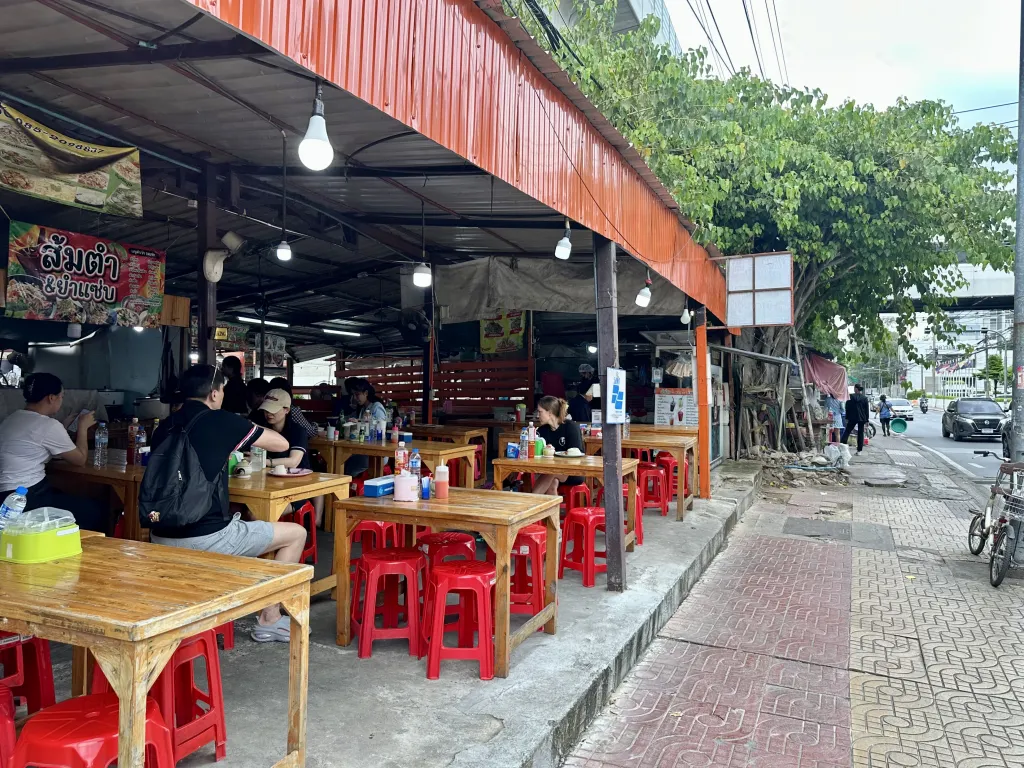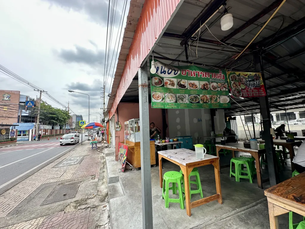 場所は、ドンムアン空港の国際線到着ロビー側からワット・ドンムアン方面へ出る。アマリホテル経由の連絡通路でもOK。道路沿いには屋台が並んでいる。この屋台は入れ替わりが激しいからだろうか、Googleマップで目的の店が出てこなかった。なので「このあたり」という感じでMAPを貼っておいた。