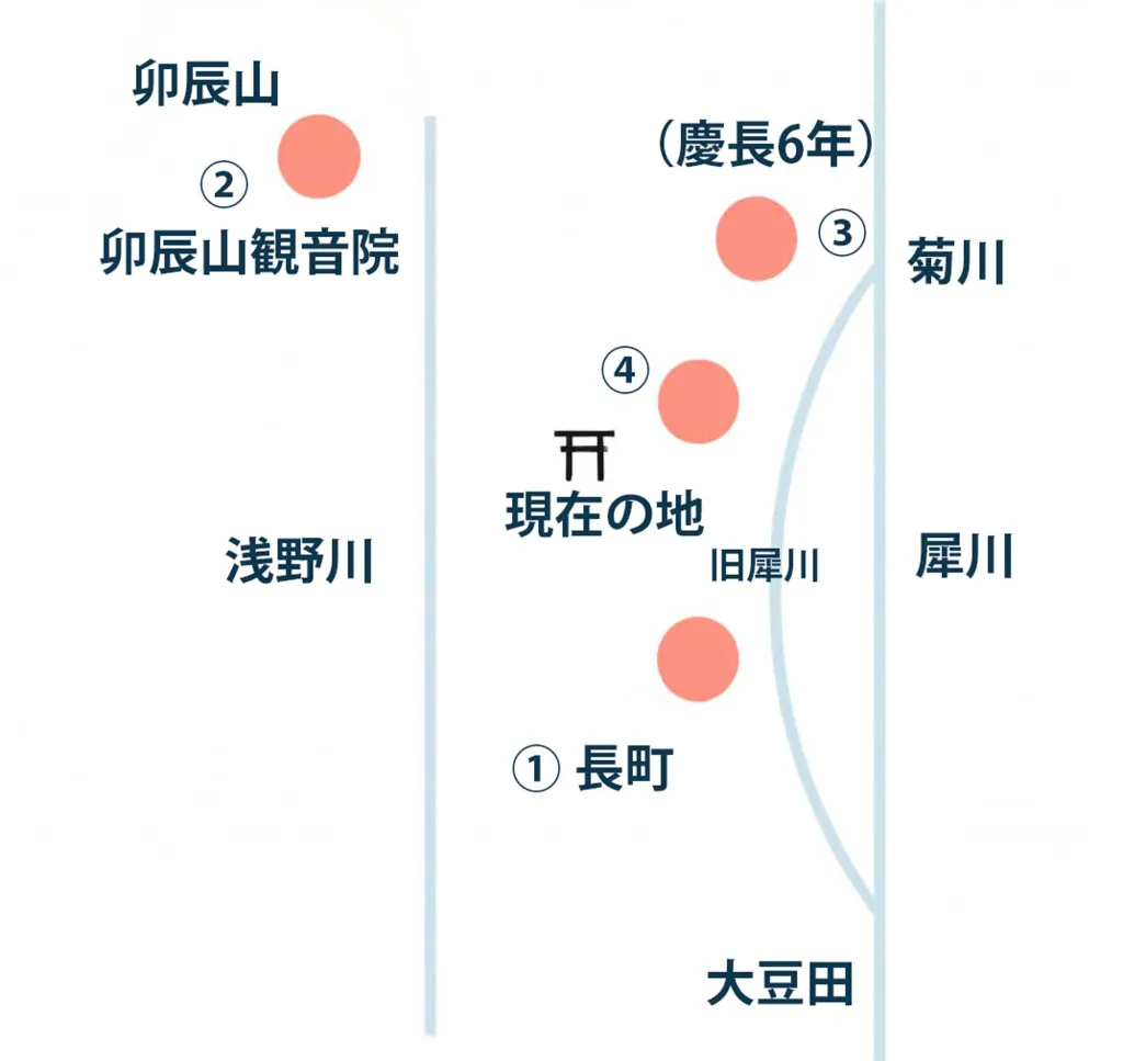 ④ 現在の地=江戸期を通じて整備が進み、近代以降の社地の核となる(城から見た鬼門方面)。1600年前半以降 ー 現在地