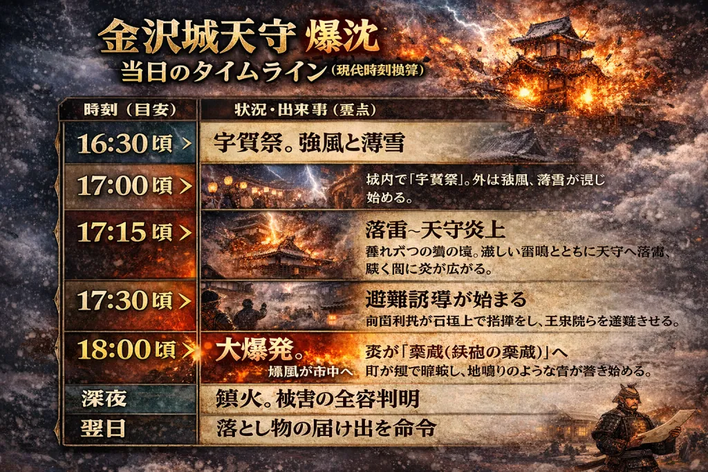 | 17:00頃 | 落雷 → 天守炎上 | 暮れ六つの鐘の頃。激しい雷鳴とともに天守へ落雷し、短時間で火が広がる。 |