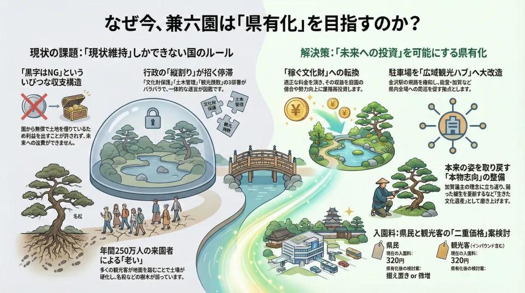 土壌はコンクリートのように硬化し、樹木の根は呼吸困難に陥り、名松の老朽化が進んでいる。 「維持管理」の範疇だけでは、これらに対する抜本的な土壌改良を行うことすら難しい。さらに、インバウンド需要の急増に伴い、多言語対応やバリアフリー化、高品位な文化体験の提供など、現代の観光地として求められる機能は高度化している。 国の所有である限り、予算獲得には財務省との折衝が必要であり、全国一律の基準が適用されるため、兼六園独自の事情に即した迅速な投資ができない。