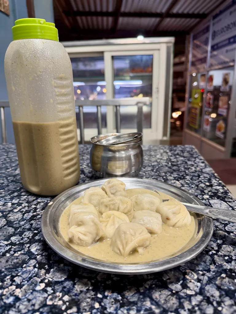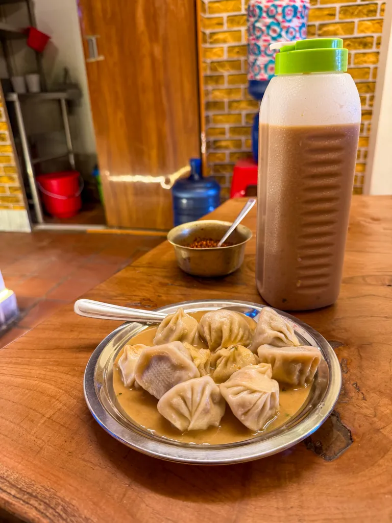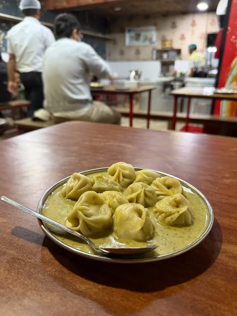 ここの最大の特徴は、スープ(ソース)に「きな粉」が使われている点だ。 エベレストやシャンダールのようなスパイス全開のスープとは異なり、きな粉由来の独特のとろみと香ばしさがある。蒸したてのモモに、この少しざらつきのある濃厚なソースを絡めて食べる。 皮は非常に薄く、噛むと口の中で肉汁が弾ける。まさに小籠包に近い感覚だが、ソースの味わいは完全にネパール独自の進化を遂げている。