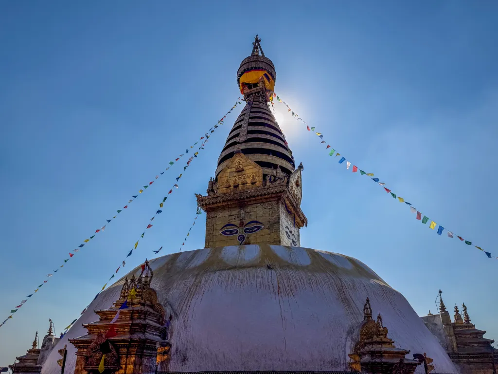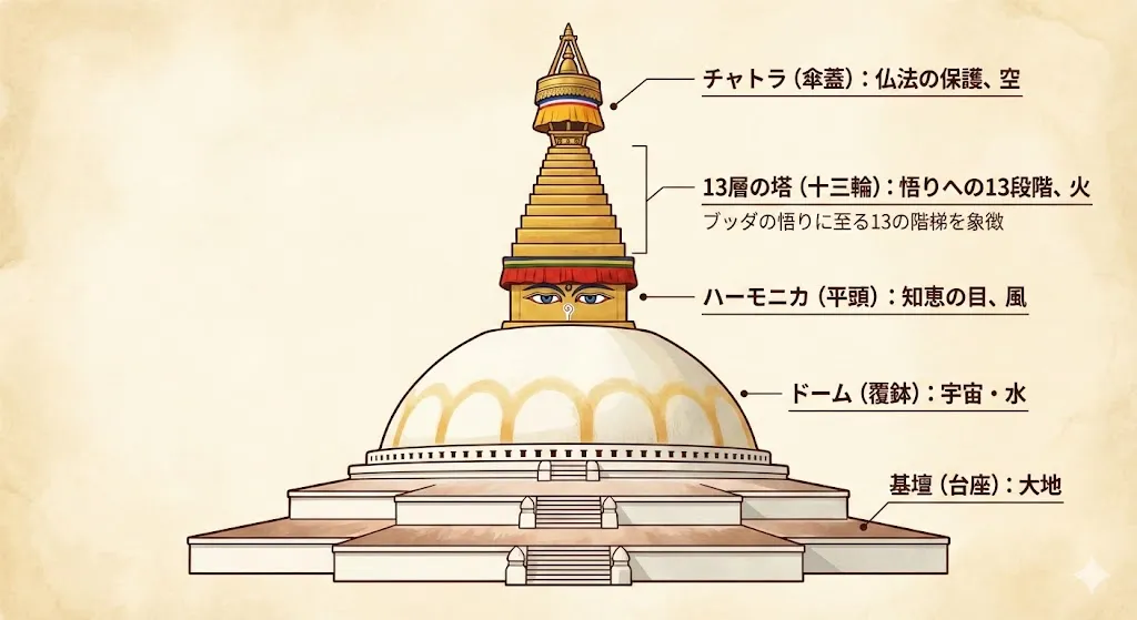 白い半球のドームに尖塔が立ち、四面にはブッダの目が描かれる。谷のどこからでも見える配置で、監視というより「見守り」の圧がある。目の下の渦巻きは鼻ではないと説明されることが多く、「1」に見立てられる記号として語られる。真理は一つ、という解釈につながる。名探偵コナンか。